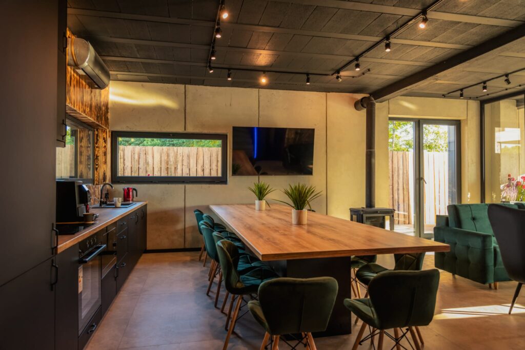 Strefa noclegowa, mieszcząca się na piętrze, zapewnia wygodę i intymność dla 16 osób. Każda z 5 sypialni wyposażona jest w własną łazienkę, gwarantując prywatność oraz komfort podczas pobytu. Strefa kuchenna, zlokalizowana na parterze, została kompleksowo wyposażona, umożliwiając samodzielne przygotowywanie posiłków w przyjemnej atmosferze. Nie zabrakło tam nowoczesnych urządzeń, które ułatwią Państwu codzienne funkcjonowanie.